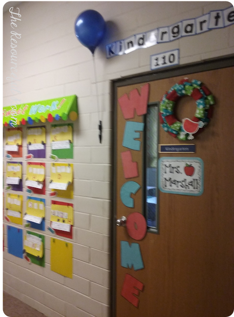 Here is our room from the hallway. I printed the "welcome" letters and made the wreath a few years back. I still love them! Our work display is another favorite of mine! It was a last minute idea that popped into my head and came together so well. I love hanging our work here for everyone to see.